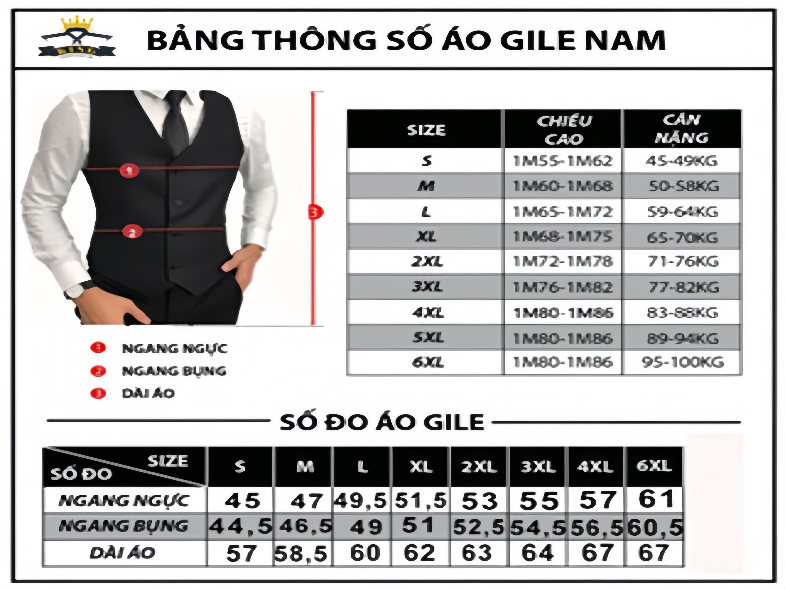 Để chọn được chiếc gile vừa vặn, bạn nên đo vòng ngực và tham khảo bảng size chi tiết của shop.